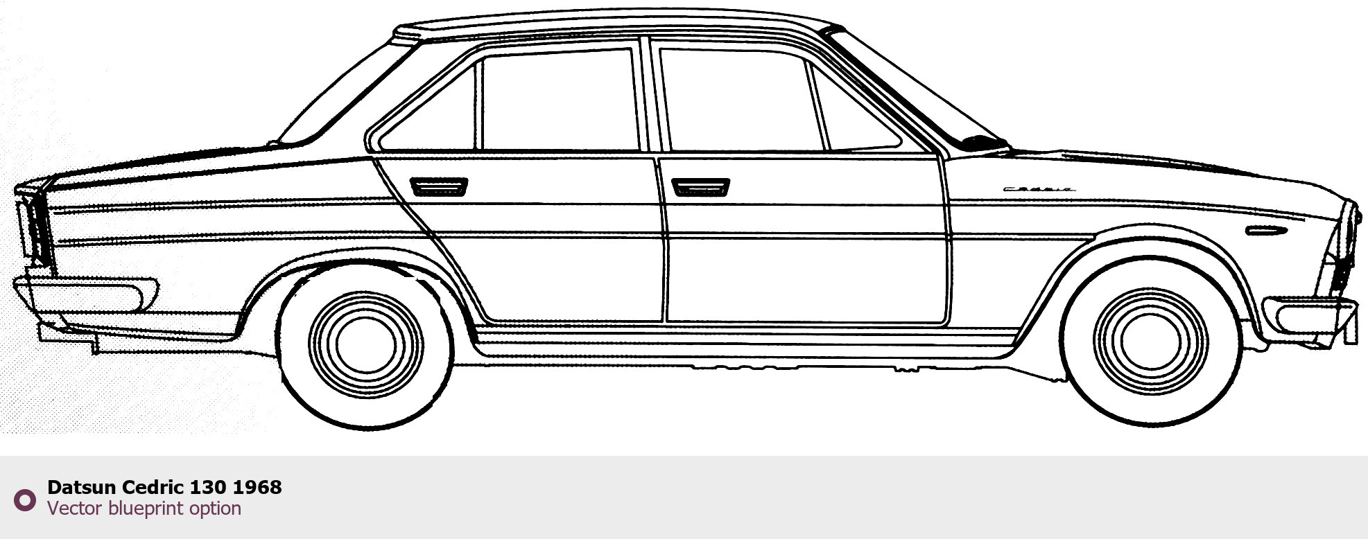 Raster blueprint of the 1968 Datsun Cedric 130 Tag. This free downloadable image can be used for graphic projects, digital design, and 3D modeling. The file provides accurate exterior proportions of the vehicle. Model year: 1968. Body type: Tag.