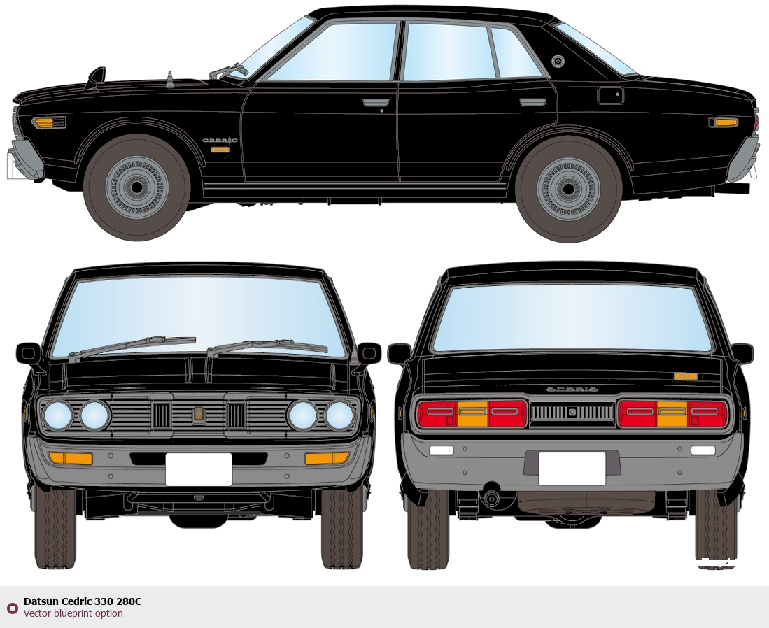 Raster blueprint of the Datsun Cedric 330 280C Tag. This free downloadable image can be used for graphic projects, digital design, and 3D modeling. The file provides accurate exterior proportions of the vehicle. Body type: Tag.