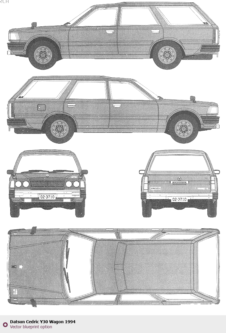 Raster blueprint of the 1994 Datsun Cedric Y30 Wagon Wagon. This free downloadable image can be used for graphic projects, digital design, and 3D modeling. The file provides accurate exterior proportions of the vehicle. Model year: 1994. Body type: Wagon.