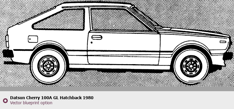 Raster blueprint of the 1980 Datsun Cherry 100A GL Hatchback Hatchback. This free downloadable image can be used for graphic projects, digital design, and 3D modeling. The file provides accurate exterior proportions of the vehicle. Model year: 1980. Body type: Hatchback.