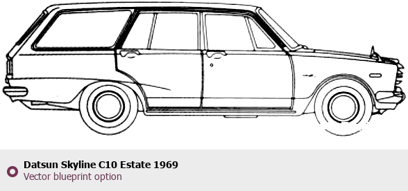 Raster blueprint of the 1969 Datsun Skyline C10 Estate Sedan. This free downloadable image can be used for graphic projects, digital design, and 3D modeling. The file provides accurate exterior proportions of the vehicle. Model year: 1969. Body type: Sedan.