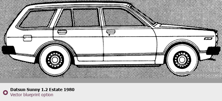 Raster blueprint of the 1980 Datsun Sunny 1.2 Estate Wagon. This free downloadable image can be used for graphic projects, digital design, and 3D modeling. The file provides accurate exterior proportions of the vehicle. Model year: 1980. Body type: Wagon.