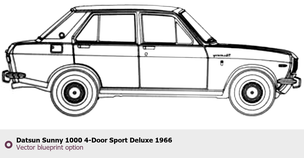 Raster blueprint of the 1966 Datsun Sunny 1000 4-Door Sport Deluxe Tag. This free downloadable image can be used for graphic projects, digital design, and 3D modeling. The file provides accurate exterior proportions of the vehicle. Model year: 1966. Body type: Tag.