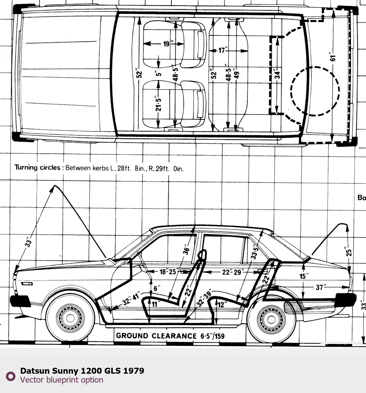 Raster blueprint of the 1979 Datsun Sunny 1200 GLS Tag. This free downloadable image can be used for graphic projects, digital design, and 3D modeling. The file provides accurate exterior proportions of the vehicle. Model year: 1979. Body type: Tag.