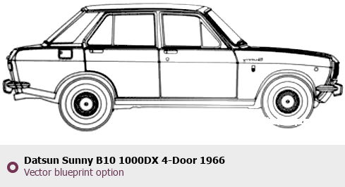 Raster blueprint of the 1966 Datsun Sunny B10 1000DX 4-Door Tag. This free downloadable image can be used for graphic projects, digital design, and 3D modeling. The file provides accurate exterior proportions of the vehicle. Model year: 1966. Body type: Tag.