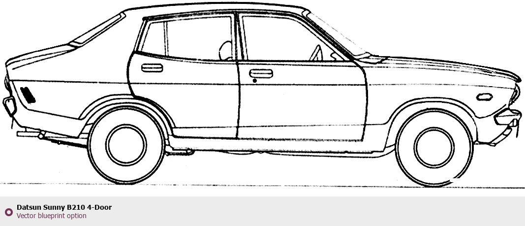 Raster blueprint of the Datsun Sunny B210 4-Door Tag. This free downloadable image can be used for graphic projects, digital design, and 3D modeling. The file provides accurate exterior proportions of the vehicle. Body type: Tag.