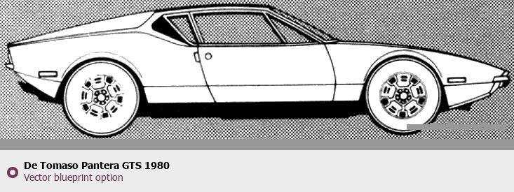 Raster blueprint of the 1980 De Tomaso Pantera GTS Coupe. This free downloadable image can be used for graphic projects, digital design, and 3D modeling. The file provides accurate exterior proportions of the vehicle. Model year: 1980. Body type: Coupe.