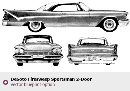 Raster blueprint of the 1959 DeSoto Firesweep Sportsman 2-Door Hardtop Tag. This free downloadable image can be used for graphic projects, digital design, and 3D modeling. The file provides accurate exterior proportions of the vehicle. Model year: 1959. Body type: Tag.
