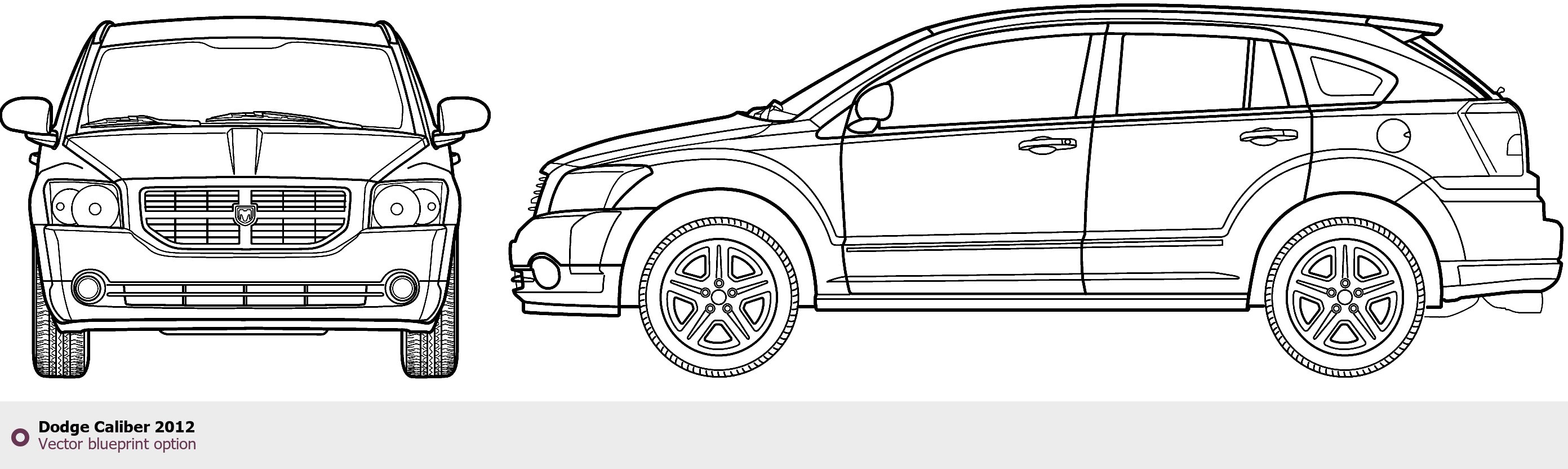 Raster blueprint of the 2012 Dodge Caliber Hatchback. This free downloadable image can be used for graphic projects, digital design, and 3D modeling. The file provides accurate exterior proportions of the vehicle. Model year: 2012. Body type: Hatchback.