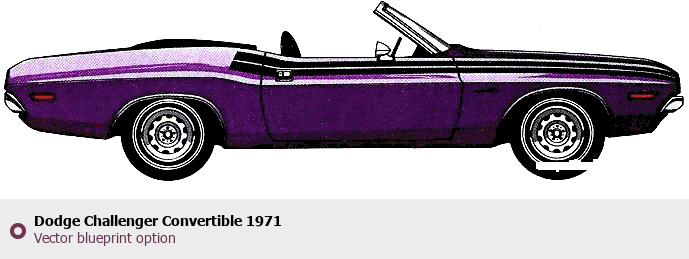 Raster blueprint of the 1971 Dodge Challenger Convertible Coupe. This free downloadable image can be used for graphic projects, digital design, and 3D modeling. The file provides accurate exterior proportions of the vehicle. Model year: 1971. Body type: Coupe.