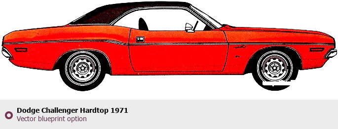 Raster blueprint of the 1971 Dodge Challenger Hardtop Coupe. This free downloadable image can be used for graphic projects, digital design, and 3D modeling. The file provides accurate exterior proportions of the vehicle. Model year: 1971. Body type: Coupe.