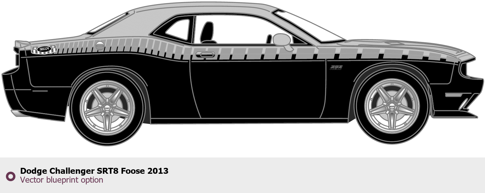 Raster blueprint of the 2013 Dodge Challenger SRT8 Foose Coupe. This free downloadable image can be used for graphic projects, digital design, and 3D modeling. The file provides accurate exterior proportions of the vehicle. Model year: 2013. Body type: Coupe.