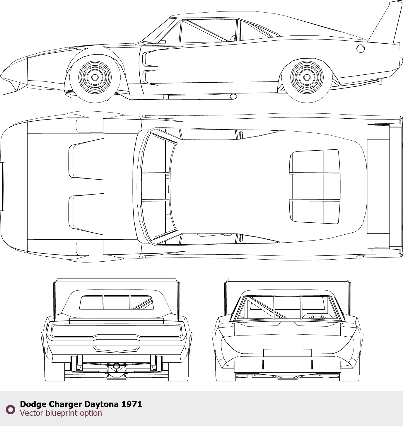 Raster blueprint of the 1971 Dodge Charger Daytona Coupe. This free downloadable image can be used for graphic projects, digital design, and 3D modeling. The file provides accurate exterior proportions of the vehicle. Model year: 1971. Body type: Coupe.