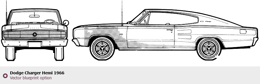 Raster blueprint of the 1966 Dodge Charger Hemi Tag. This free downloadable image can be used for graphic projects, digital design, and 3D modeling. The file provides accurate exterior proportions of the vehicle. Model year: 1966. Body type: Tag.