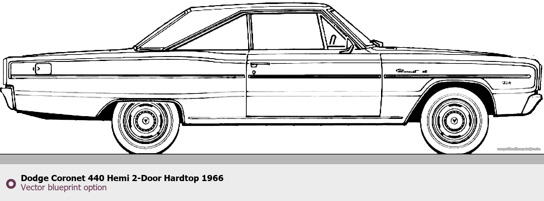 Raster blueprint of the 1966 Dodge Coronet 440 Hemi 2-Door Hardtop Tag. This free downloadable image can be used for graphic projects, digital design, and 3D modeling. The file provides accurate exterior proportions of the vehicle. Model year: 1966. Body type: Tag.