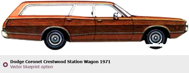 Raster blueprint of the 1971 Dodge Coronet Crestwood Station Wagon Wagon. This free downloadable image can be used for graphic projects, digital design, and 3D modeling. The file provides accurate exterior proportions of the vehicle. Model year: 1971. Body type: Wagon.