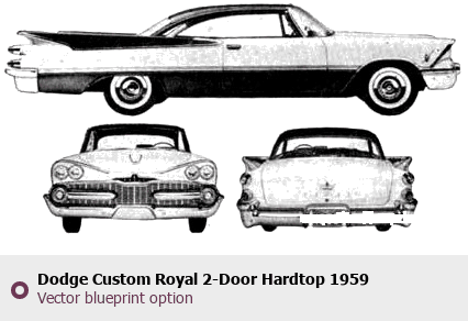 Raster blueprint of the 1959 Dodge Custom Royal 2-Door Hardtop Tag. This free downloadable image can be used for graphic projects, digital design, and 3D modeling. The file provides accurate exterior proportions of the vehicle. Model year: 1959. Body type: Tag.