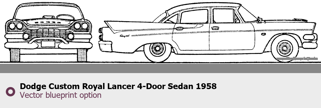 Raster blueprint of the 1958 Dodge Custom Royal Lancer 4-Door Sedan Sedan. This free downloadable image can be used for graphic projects, digital design, and 3D modeling. The file provides accurate exterior proportions of the vehicle. Model year: 1958. Body type: Sedan.