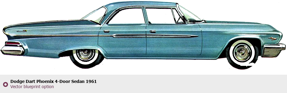 Raster blueprint of the 1961 Dodge Dart Phoenix 4-Door Sedan Sedan. This free downloadable image can be used for graphic projects, digital design, and 3D modeling. The file provides accurate exterior proportions of the vehicle. Model year: 1961. Body type: Sedan.