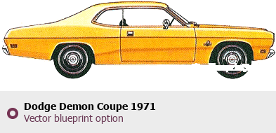 Raster blueprint of the 1971 Dodge Demon Coupe Coupe. This free downloadable image can be used for graphic projects, digital design, and 3D modeling. The file provides accurate exterior proportions of the vehicle. Model year: 1971. Body type: Coupe.