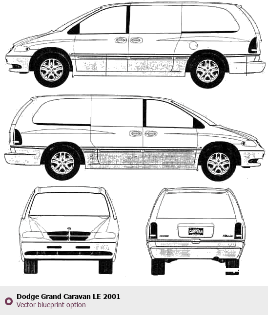 Raster blueprint of the 2001 Dodge Grand Caravan LE Minivan. This free downloadable image can be used for graphic projects, digital design, and 3D modeling. The file provides accurate exterior proportions of the vehicle. Model year: 2001. Body type: Minivan.