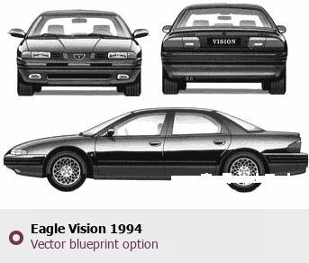 Raster blueprint of the 1994 Eagle Vision Sedan. This free downloadable image can be used for graphic projects, digital design, and 3D modeling. The file provides accurate exterior proportions of the vehicle. Model year: 1994. Body type: Sedan.
