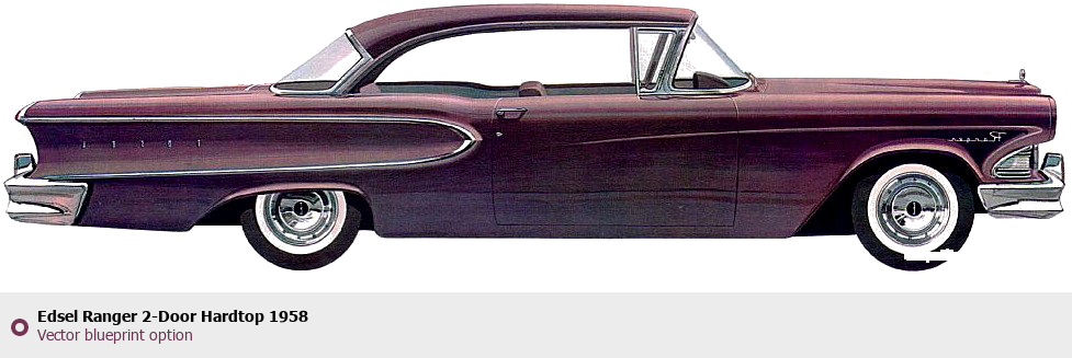 Raster blueprint of the 1958 Edsel Ranger 2-Door Hardtop Tag. This free downloadable image can be used for graphic projects, digital design, and 3D modeling. The file provides accurate exterior proportions of the vehicle. Model year: 1958. Body type: Tag.