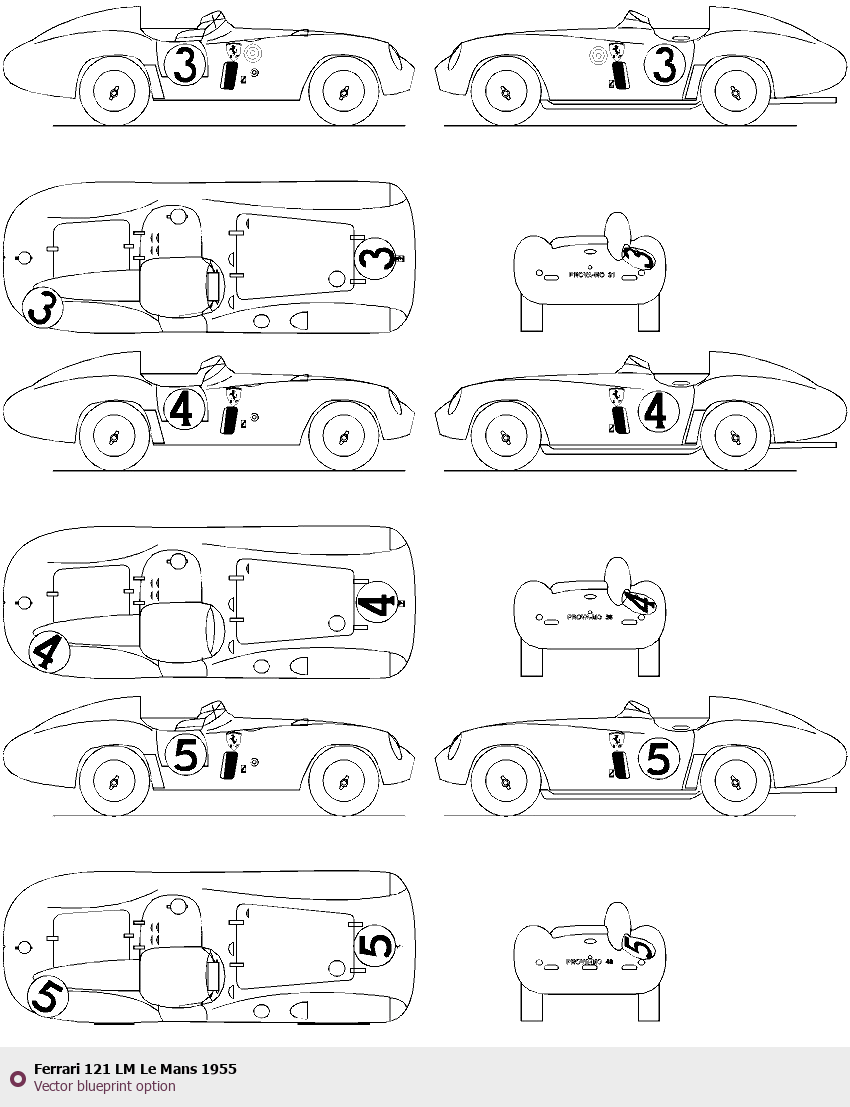 Raster blueprint of the 1955 Ferrari 121 LM Le Mans Tag. This free downloadable image can be used for graphic projects, digital design, and 3D modeling. The file provides accurate exterior proportions of the vehicle. Model year: 1955. Body type: Tag.