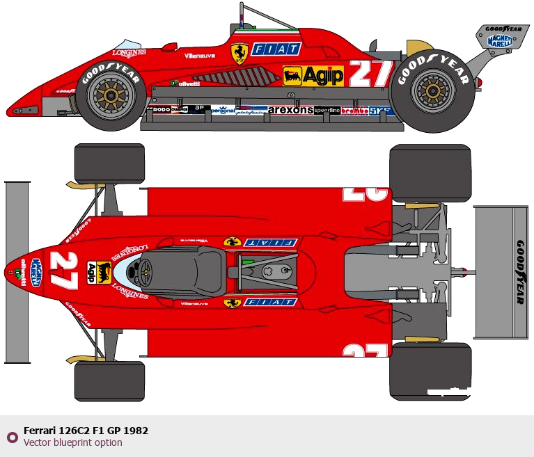Raster blueprint of the 1982 Ferrari 126C2 F1 GP Formula. This free downloadable image can be used for graphic projects, digital design, and 3D modeling. The file provides accurate exterior proportions of the vehicle. Model year: 1982. Body type: Formula.