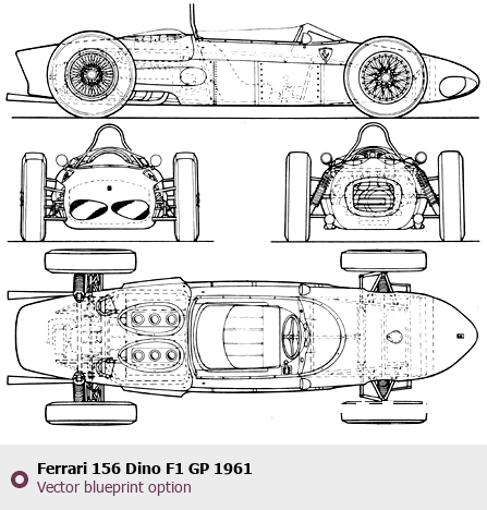 Raster blueprint of the 1961 Ferrari 156 Dino F1 GP Formula. This free downloadable image can be used for graphic projects, digital design, and 3D modeling. The file provides accurate exterior proportions of the vehicle. Model year: 1961. Body type: Formula.