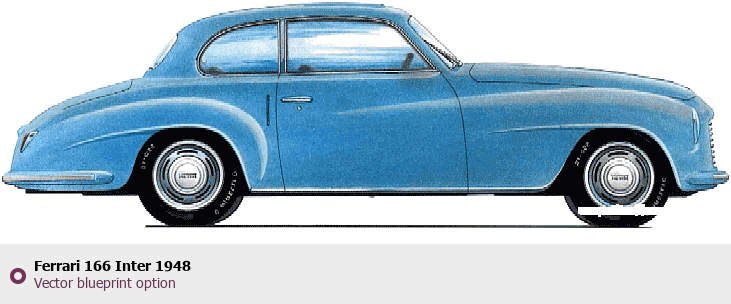 Raster blueprint of the 1948 Ferrari 166 Inter Tag. This free downloadable image can be used for graphic projects, digital design, and 3D modeling. The file provides accurate exterior proportions of the vehicle. Model year: 1948. Body type: Tag.