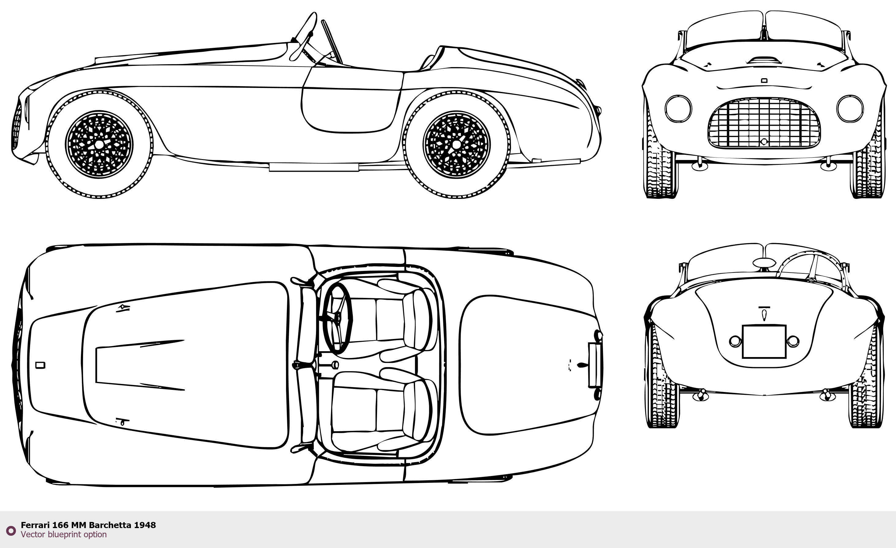 Raster blueprint of the 1948 Ferrari 166 MM Barchetta Tag. This free downloadable image can be used for graphic projects, digital design, and 3D modeling. The file provides accurate exterior proportions of the vehicle. Model year: 1948. Body type: Tag.