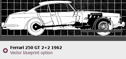 Raster blueprint of the 1962 Ferrari 250 GT 2+2 Coupe. This free downloadable image can be used for graphic projects, digital design, and 3D modeling. The file provides accurate exterior proportions of the vehicle. Model year: 1962. Body type: Coupe.