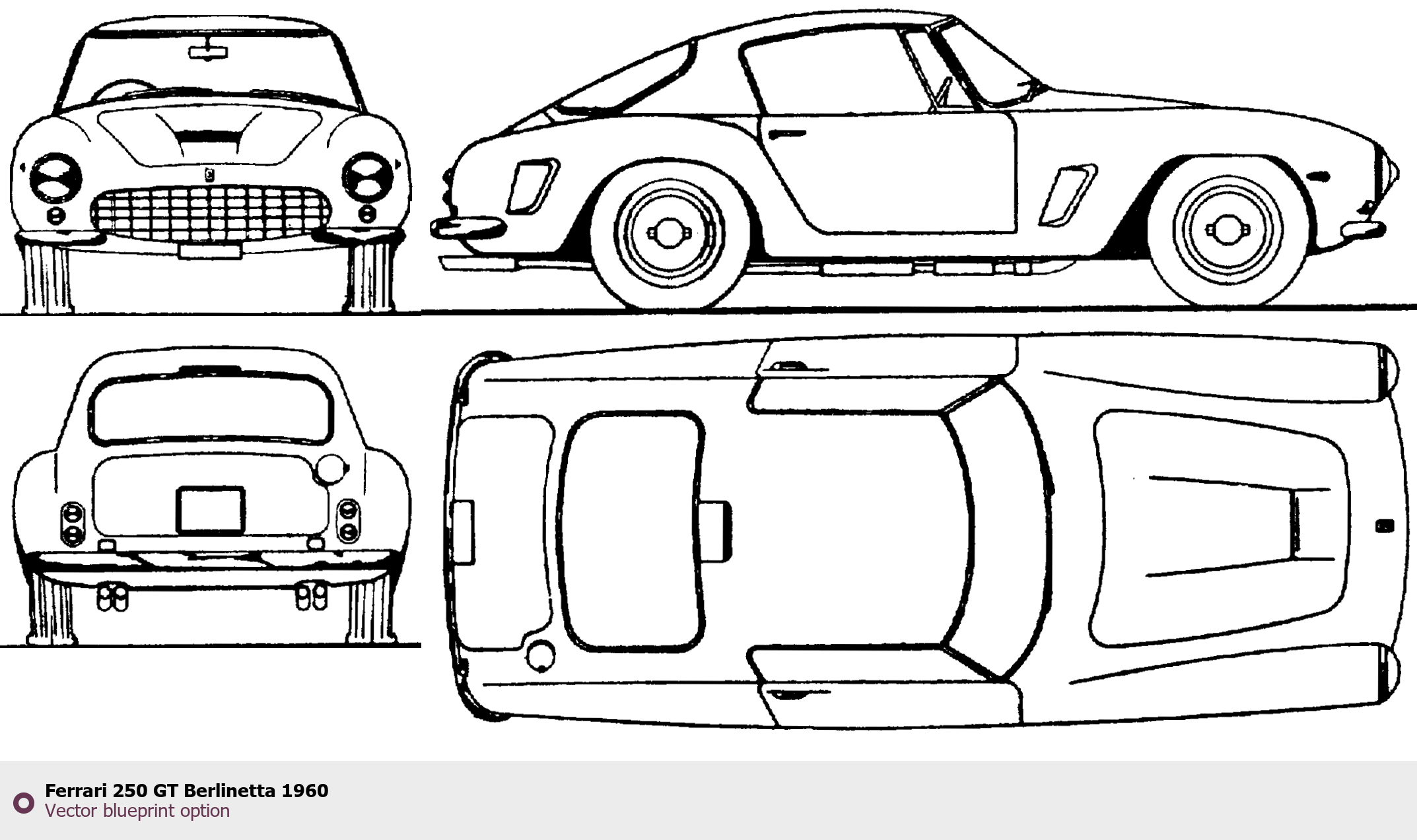 Raster blueprint of the 1960 Ferrari 250 GT Berlinetta Coupe. This free downloadable image can be used for graphic projects, digital design, and 3D modeling. The file provides accurate exterior proportions of the vehicle. Model year: 1960. Body type: Coupe.