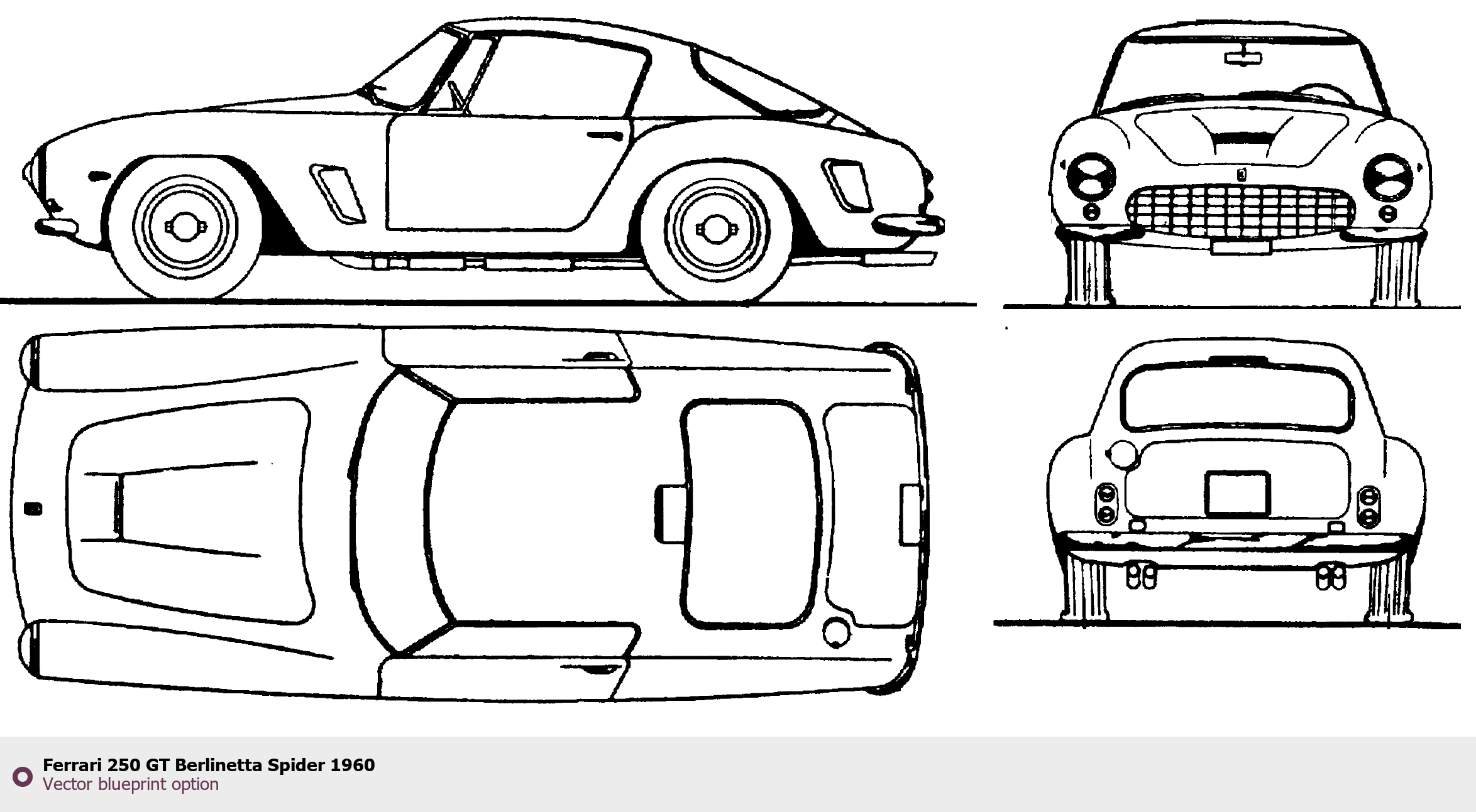 Raster blueprint of the 1960 Ferrari 250 GT Berlinetta Spider Coupe. This free downloadable image can be used for graphic projects, digital design, and 3D modeling. The file provides accurate exterior proportions of the vehicle. Model year: 1960. Body type: Coupe.
