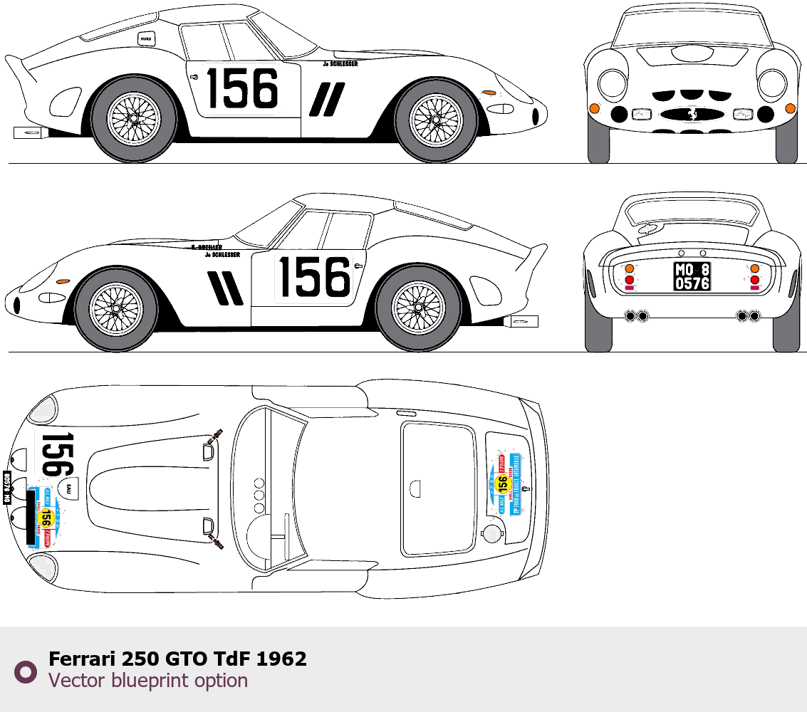Raster blueprint of the 1962 Ferrari 250 GTO TdF Coupe. This free downloadable image can be used for graphic projects, digital design, and 3D modeling. The file provides accurate exterior proportions of the vehicle. Model year: 1962. Body type: Coupe.