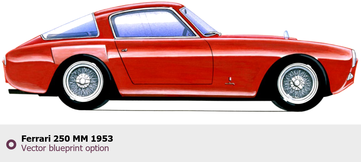 Raster blueprint of the 1953 Ferrari 250 MM Coupe. This free downloadable image can be used for graphic projects, digital design, and 3D modeling. The file provides accurate exterior proportions of the vehicle. Model year: 1953. Body type: Coupe.
