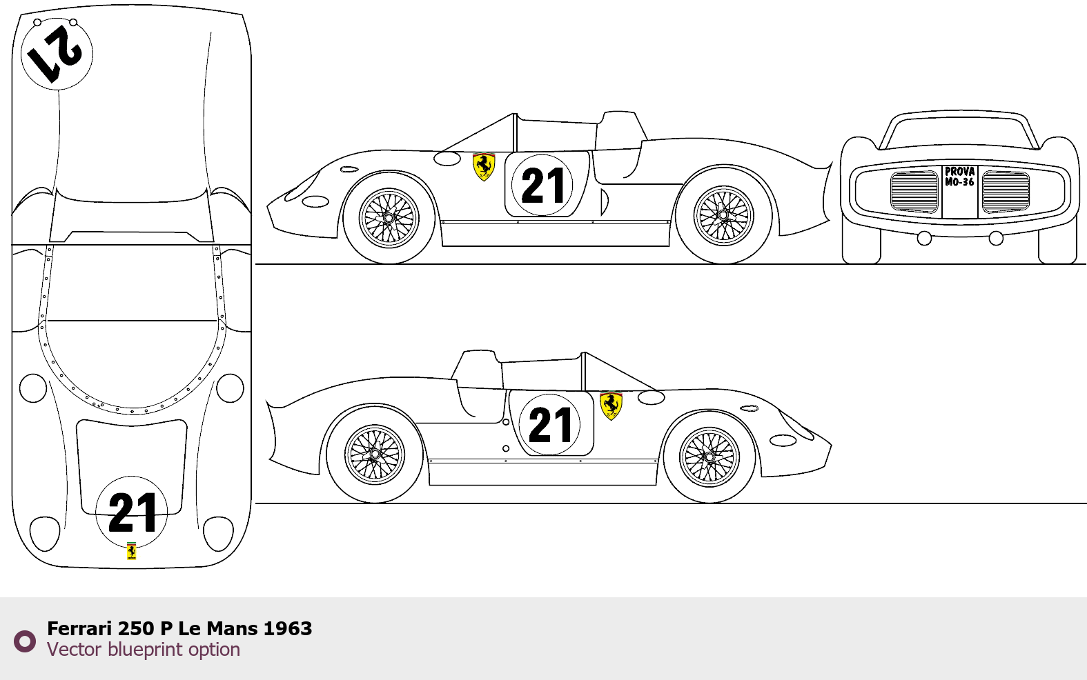 Raster blueprint of the 1963 Ferrari 250 P Le Mans Coupe. This free downloadable image can be used for graphic projects, digital design, and 3D modeling. The file provides accurate exterior proportions of the vehicle. Model year: 1963. Body type: Coupe.