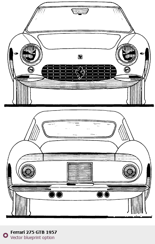 Raster blueprint of the 1957 Ferrari 275 GTB Tag. This free downloadable image can be used for graphic projects, digital design, and 3D modeling. The file provides accurate exterior proportions of the vehicle. Model year: 1957. Body type: Tag.