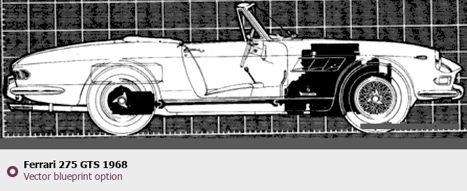 Raster blueprint of the 1968 Ferrari 275 GTS Tag. This free downloadable image can be used for graphic projects, digital design, and 3D modeling. The file provides accurate exterior proportions of the vehicle. Model year: 1968. Body type: Tag.