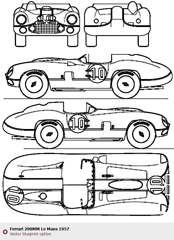 Raster blueprint of the 1957 Ferrari 290MM Le Mans Formula. This free downloadable image can be used for graphic projects, digital design, and 3D modeling. The file provides accurate exterior proportions of the vehicle. Model year: 1957. Body type: Formula.