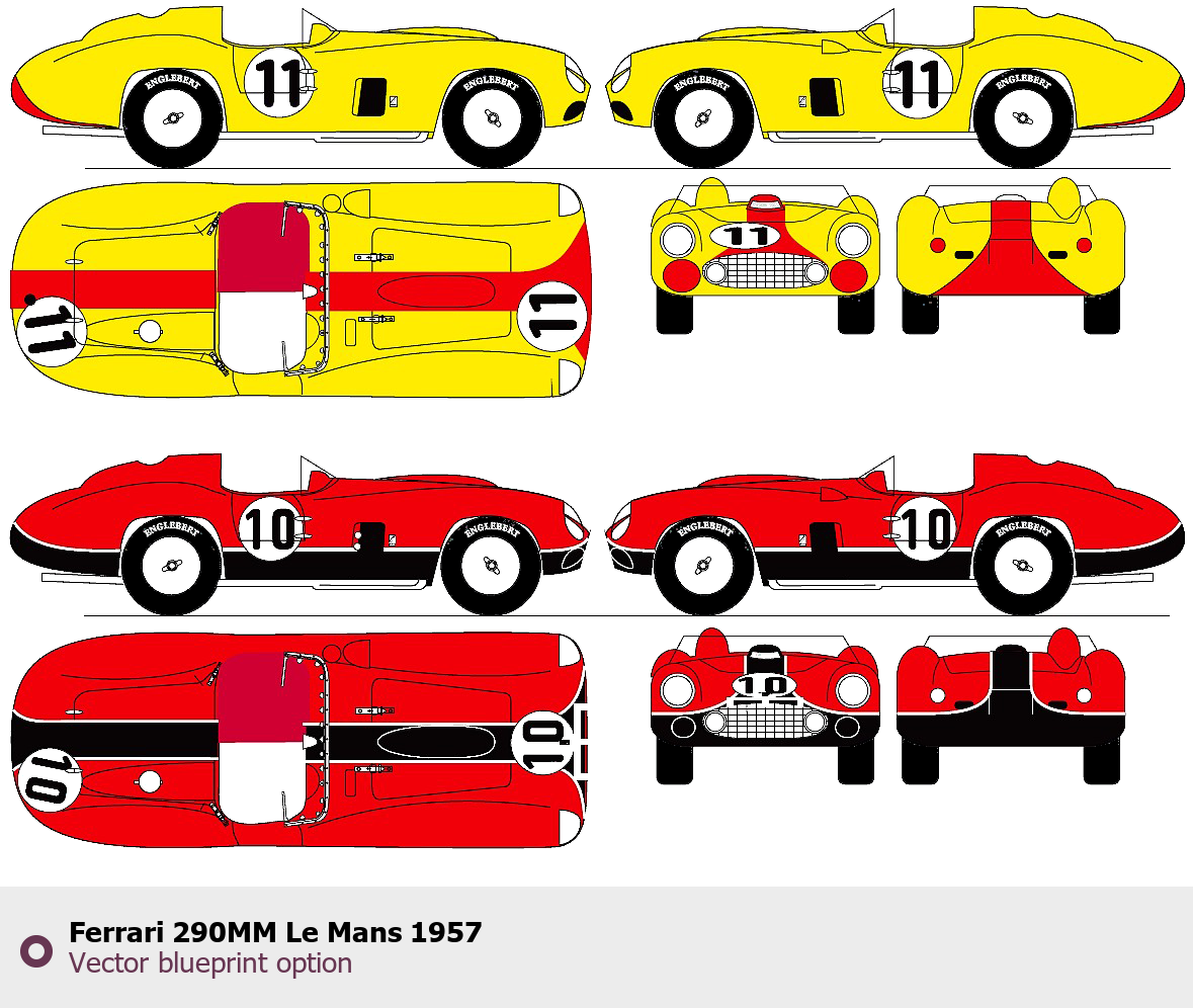 Raster blueprint of the 1957 Ferrari 290MM Le Mans Formula. This free downloadable image can be used for graphic projects, digital design, and 3D modeling. The file provides accurate exterior proportions of the vehicle. Model year: 1957. Body type: Formula.