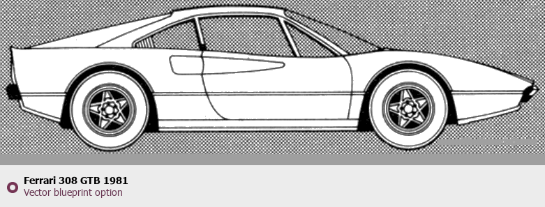 Raster blueprint of the 1981 Ferrari 308 GTB Tag. This free downloadable image can be used for graphic projects, digital design, and 3D modeling. The file provides accurate exterior proportions of the vehicle. Model year: 1981. Body type: Tag.