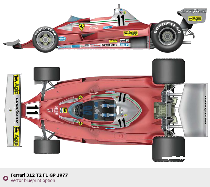 Raster blueprint of the 1977 Ferrari 312 T2 F1 GP Formula. This free downloadable image can be used for graphic projects, digital design, and 3D modeling. The file provides accurate exterior proportions of the vehicle. Model year: 1977. Body type: Formula.