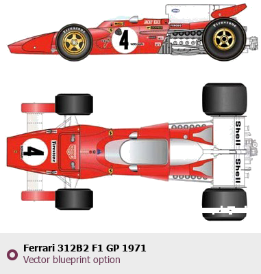 Raster blueprint of the 1971 Ferrari 312B2 F1 GP Formula. This free downloadable image can be used for graphic projects, digital design, and 3D modeling. The file provides accurate exterior proportions of the vehicle. Model year: 1971. Body type: Formula.