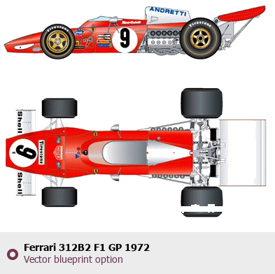 Raster blueprint of the 1972 Ferrari 312B2 F1 GP Formula. This free downloadable image can be used for graphic projects, digital design, and 3D modeling. The file provides accurate exterior proportions of the vehicle. Model year: 1972. Body type: Formula.