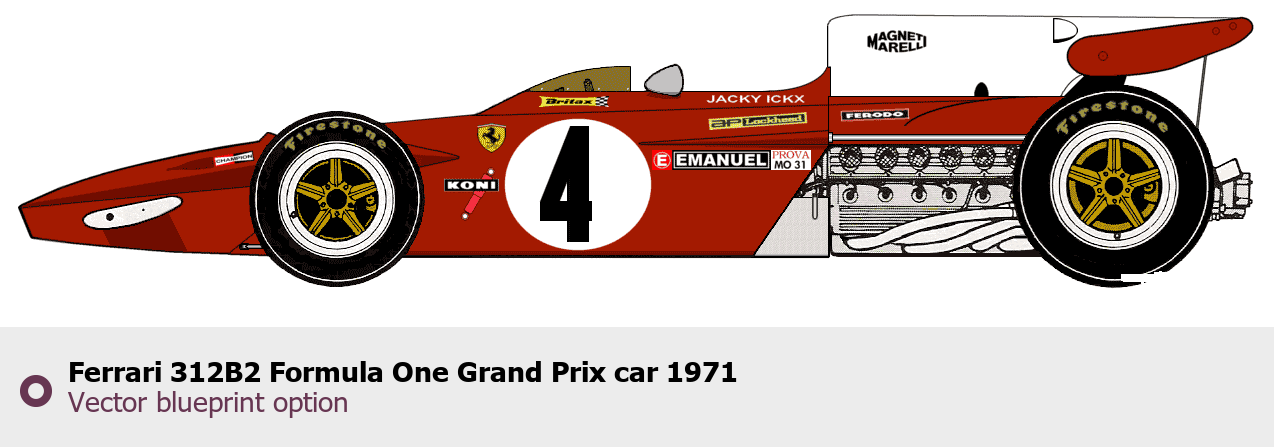 Raster blueprint of the 1971 Ferrari 312B2 Formula One Grand Prix car Formula. This free downloadable image can be used for graphic projects, digital design, and 3D modeling. The file provides accurate exterior proportions of the vehicle. Model year: 1971. Body type: Formula.