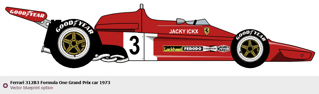 Raster blueprint of the 1973 Ferrari 312B3 Formula One Grand Prix car Formula. This free downloadable image can be used for graphic projects, digital design, and 3D modeling. The file provides accurate exterior proportions of the vehicle. Model year: 1973. Body type: Formula.