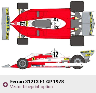 Raster blueprint of the 1978 Ferrari 312T3 F1 GP Formula. This free downloadable image can be used for graphic projects, digital design, and 3D modeling. The file provides accurate exterior proportions of the vehicle. Model year: 1978. Body type: Formula.