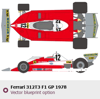 Raster blueprint of the 1978 Ferrari 312T3 F1 GP Formula. This free downloadable image can be used for graphic projects, digital design, and 3D modeling. The file provides accurate exterior proportions of the vehicle. Model year: 1978. Body type: Formula.